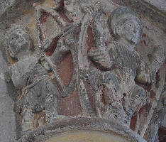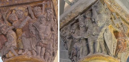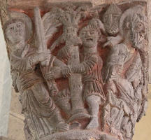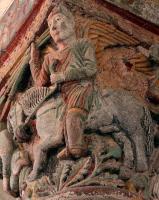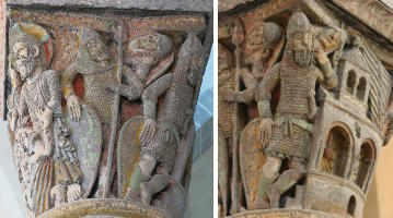 A-D — Flagellation; E — Oppressive knight; F — Guards at the Holy Sepulchre; G — The Betrayal; H — Horseman of the Apocalypse. The region of the Auvergne is rich in Romanesque carvings illustrating military equipment. These indicate that the area was a kind of cultural frontier between north and south and that the late 11th and early 12th centuries were a time of technological change. This is most clearly illustrated in the helmets, of which there are quite a variety. Low-domed types, apparently of two segments joined along a central comb and strengthened by a wide rim, are almost certainly descended from late-Roman forms (A, B and G). Conical segmented or fluted helmets with nasals seem to mirror the slightly simpler conical helmets of northern France (G, E and A similar form, though lacking a nasal, is worn by the unarmoured Horseman of the Apocalypse. Most mail hauberks have mid-length sleeves and reach only to the upper or mid-thighs. A very interesting feature of these mail armours is their integral coifs with ventails across the lower part of the face. All would be laced at the left temple and are twice shown laced in this manner (C and E). Elsewhere they hang down from the chin (A, B, F and G), forming a roughly rectangular shape which probably explains the square shapes shown below the throats of mail-clad warriors in two Catalan Bibles and in the Anglo-Norman Bayeux Tapestry. Shields are basically kite-shaped. Swords are broad and straight with round (A), quatrefoil (C) and nut-shaped (F) pommels. One is carried beneath the hauberk with its hilt protruding through a slit in the mail (A). Another is carried from a knotted sword-belt (F). Two war-axes are shown, both with half-moon blades (F and G). One has a substantial spike at the back which makes it closer to the weapon seen at Moissac and others in Spain. Such a feature was not characteristic of Northern European weapons at this time. Another figure (G) also illustrates a substantial but rather mysterious glaive-like hafted weapon. It has a long, apparently single-edged blade but the haft is mostly obscured.