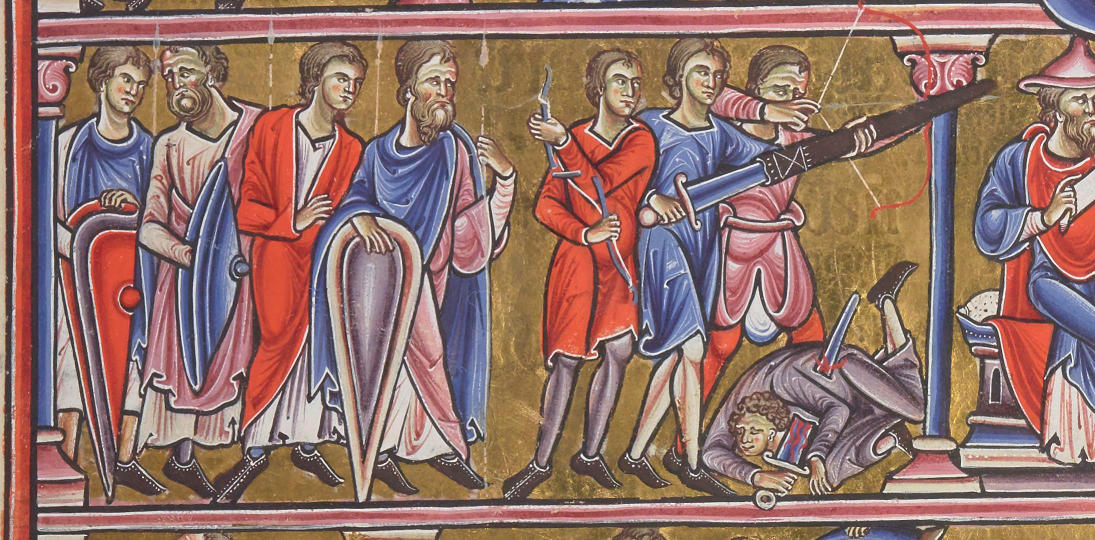 An even larger detail of the left of the 2nd register of f.62v a Psalm by David, from Christ Church Abbey, Canterbury, 1176-1200AD. Bibliothèque nationale de France. MS Latin 8846.