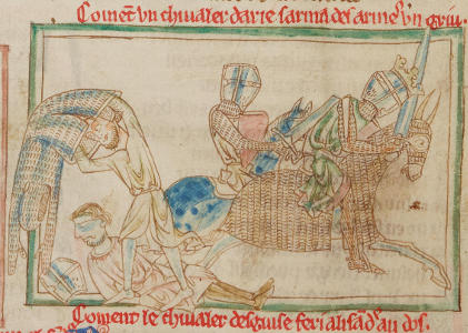The horsemen in one miniature (H and I) are equipped with standard mid-13th-century arms.