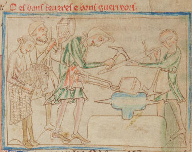 Of good blacksmiths and good warriors. 'Romance of Alexander' by Thomas of Kent. Trinity College, Cambridge, England. MS O.9.34.