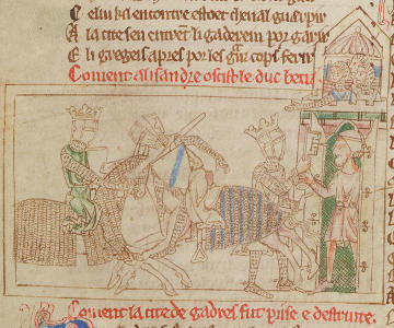 How Alexander slew the Duke Betiz. How the city of Gaza was captured and destroyed. 'Romance of Alexander' by Thomas of Kent. Trinity College, Cambridge. MS O.9.34.