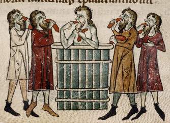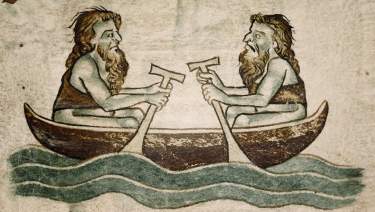 ![]() An Irish king bathes in a stew of mare's meat | ![]() Two Irishmen of Connaught paddling a boat |