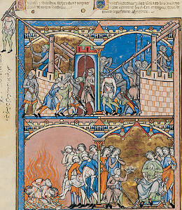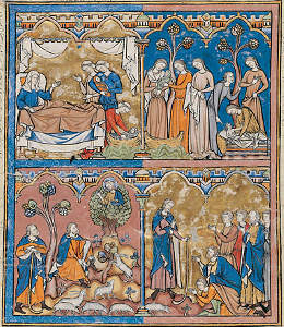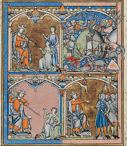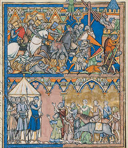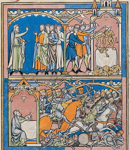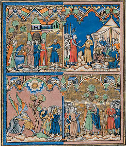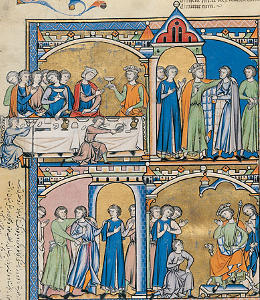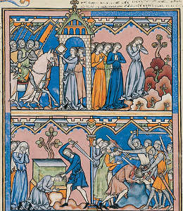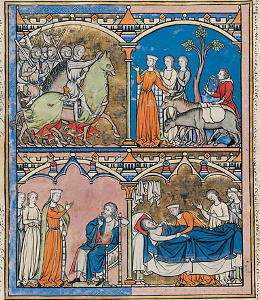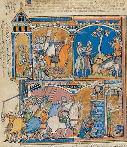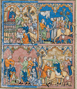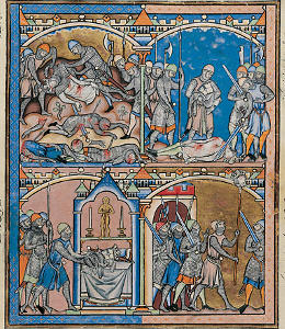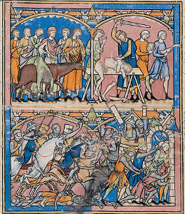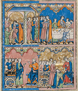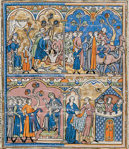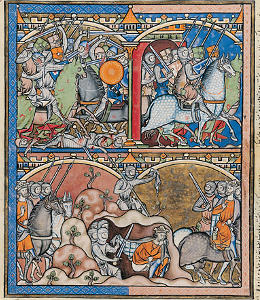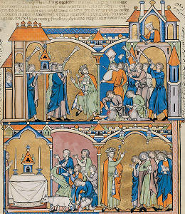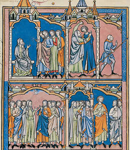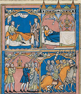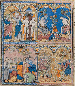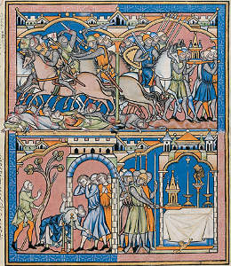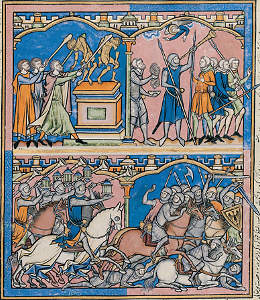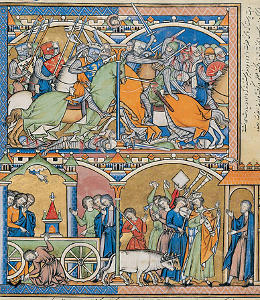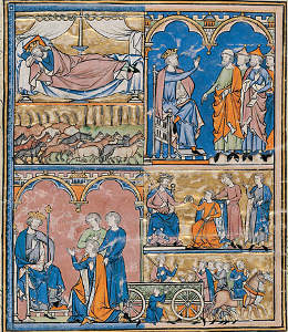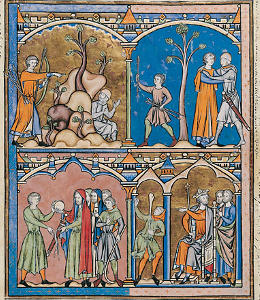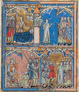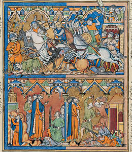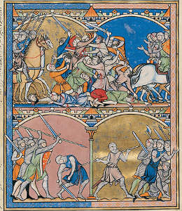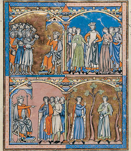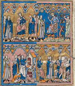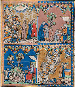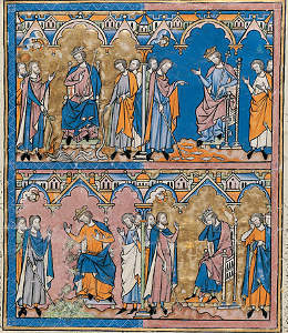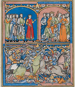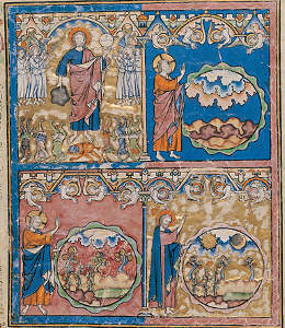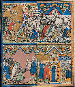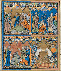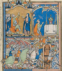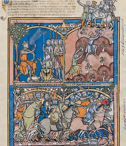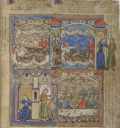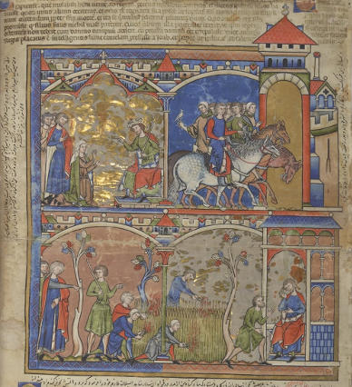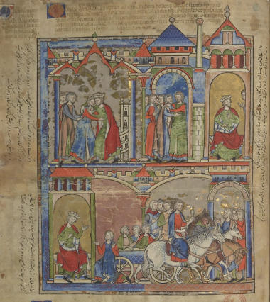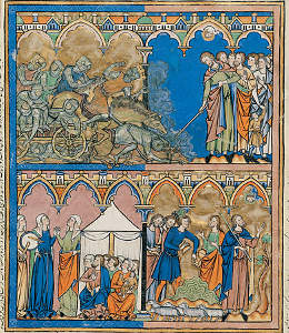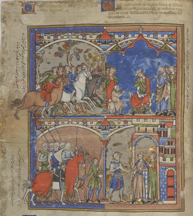 The Morgan Crusader Bible was originally a Picture Bible without text created for and likely commissioned by Louis IX, the crusader king of France (1226-1270). It presented Old Testament history with an emphasis on holy war and kingship. Six painters participated in the illumination of the Gothic Crusader Bible. Their miniatures are not only different in style but also in terms of colouring. A very clear difference is discernible in the rich use of gold. The original binding was lost during the centuries. Sometime after the death of Louis IX, unknown scribes added Latin texts to the margins of the manuscript. There are also more modern inscriptions added including Persian and Judeo-Persian.