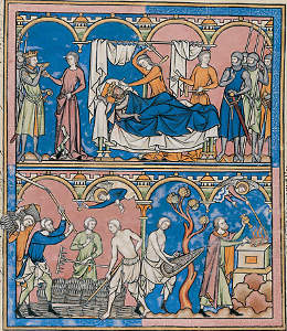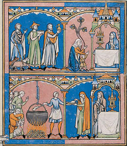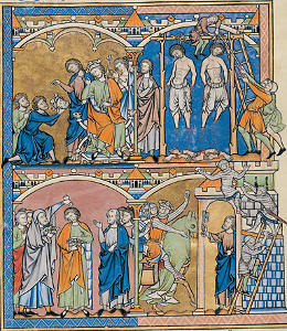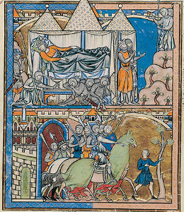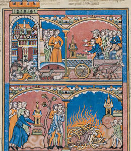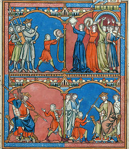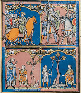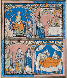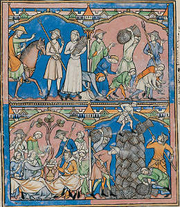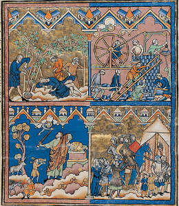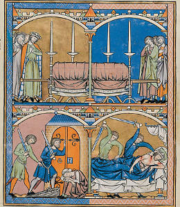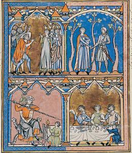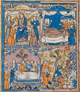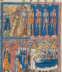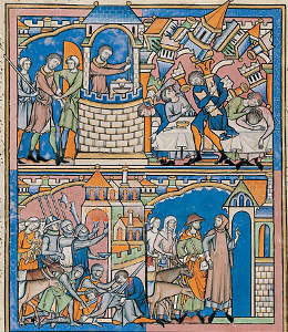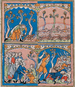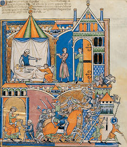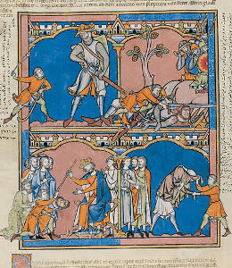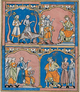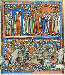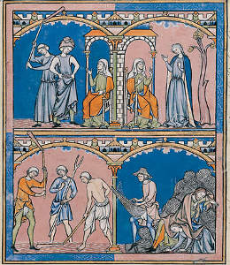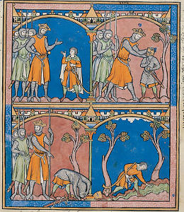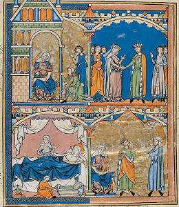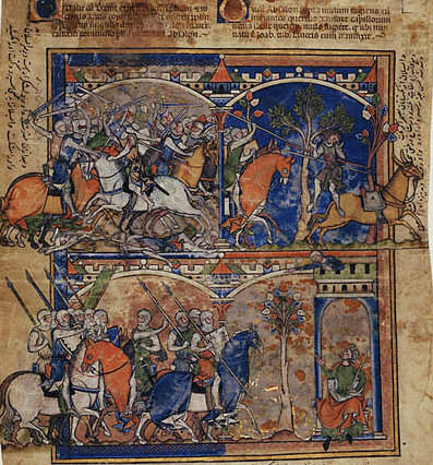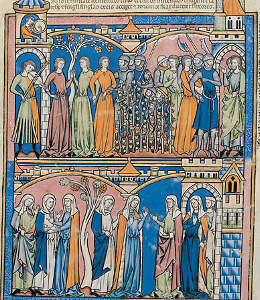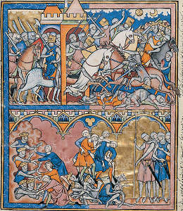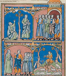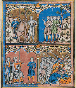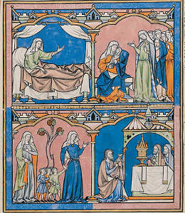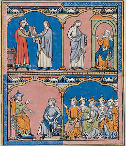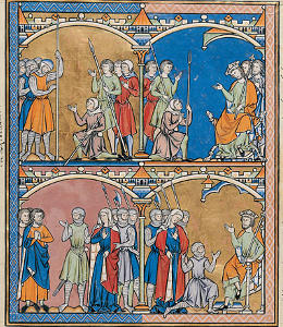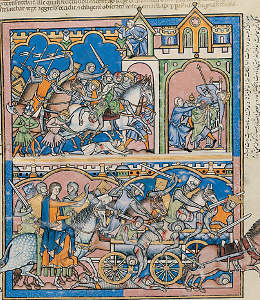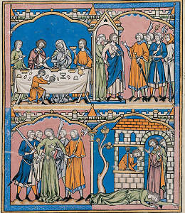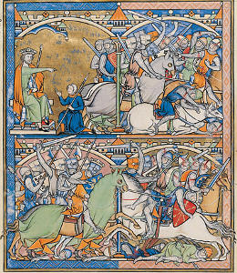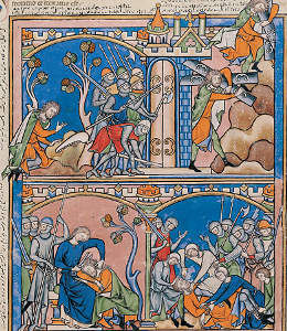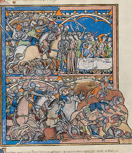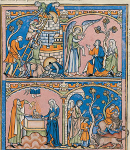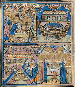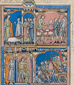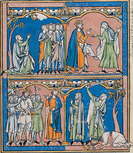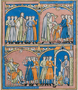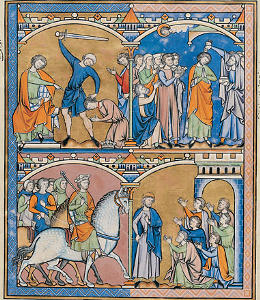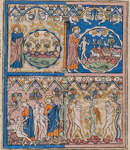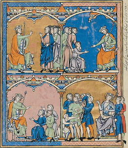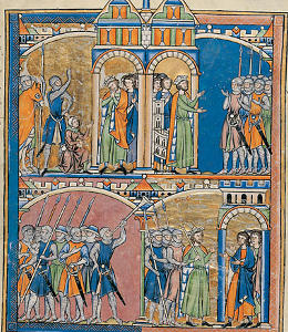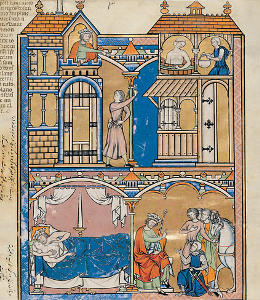 The Morgan Crusader Bible was originally a Picture Bible without text created for and likely commissioned by Louis IX, the crusader king of France (1226-1270). It presented Old Testament history with an emphasis on holy war and kingship. Six painters participated in the illumination of the Gothic Crusader Bible. Their miniatures are not only different in style but also in terms of colouring. A very clear difference is discernible in the rich use of gold. The original binding was lost during the centuries. Sometime after the death of Louis IX, unknown scribes added Latin texts to the margins of the manuscript. There are also more modern inscriptions added including Persian and Judeo-Persian.
