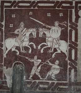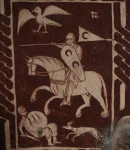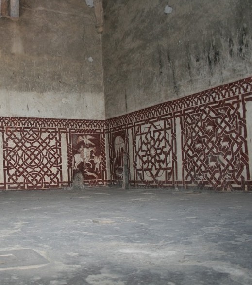 Entre los motivos representados destaca la ornamentación de lacería, que cubre casi toda la superficie formando multitud de estrellas y figuras de gran belleza. Entre esta decoración geométrica el artista representó también plantas, animales, guerreros y hasta el asedio a un castillo, todo ello empleando únicamente un color rojo intenso aplicado sobre el yeso blanco del revoco. Se atribuye a un artista musulmán tanto por el predominio de motivos mudéjares, como sobre todo por las inscripciones en árabe que repiten la jaculatoria: “De Dios es el Poder. Demos gracias a Dios”. Source: duero mudéjar