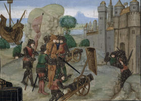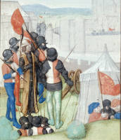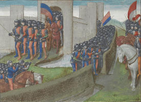 'Siege of Tanis' in Histoire d'Outremer by William of Tyre, Bruges, Belgium, c. 1480. British Library, Royal MS 15 E I, fol. 357r.