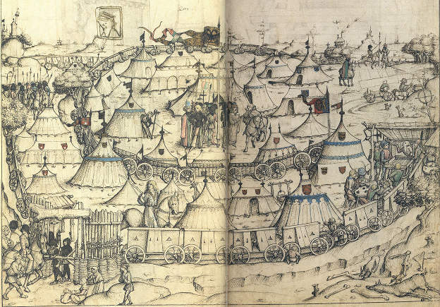 See also a Hussite Wagon Fortress, (Pseudo-)Johannes Hartlieb: 'Kriegsbuch', 1437. Österreichischen Nationalbibliothek Cod. 3062 Han