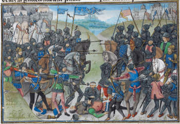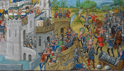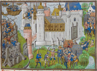![]() f.14v Battle between the garrisons of Cherbourg and Montebourg |