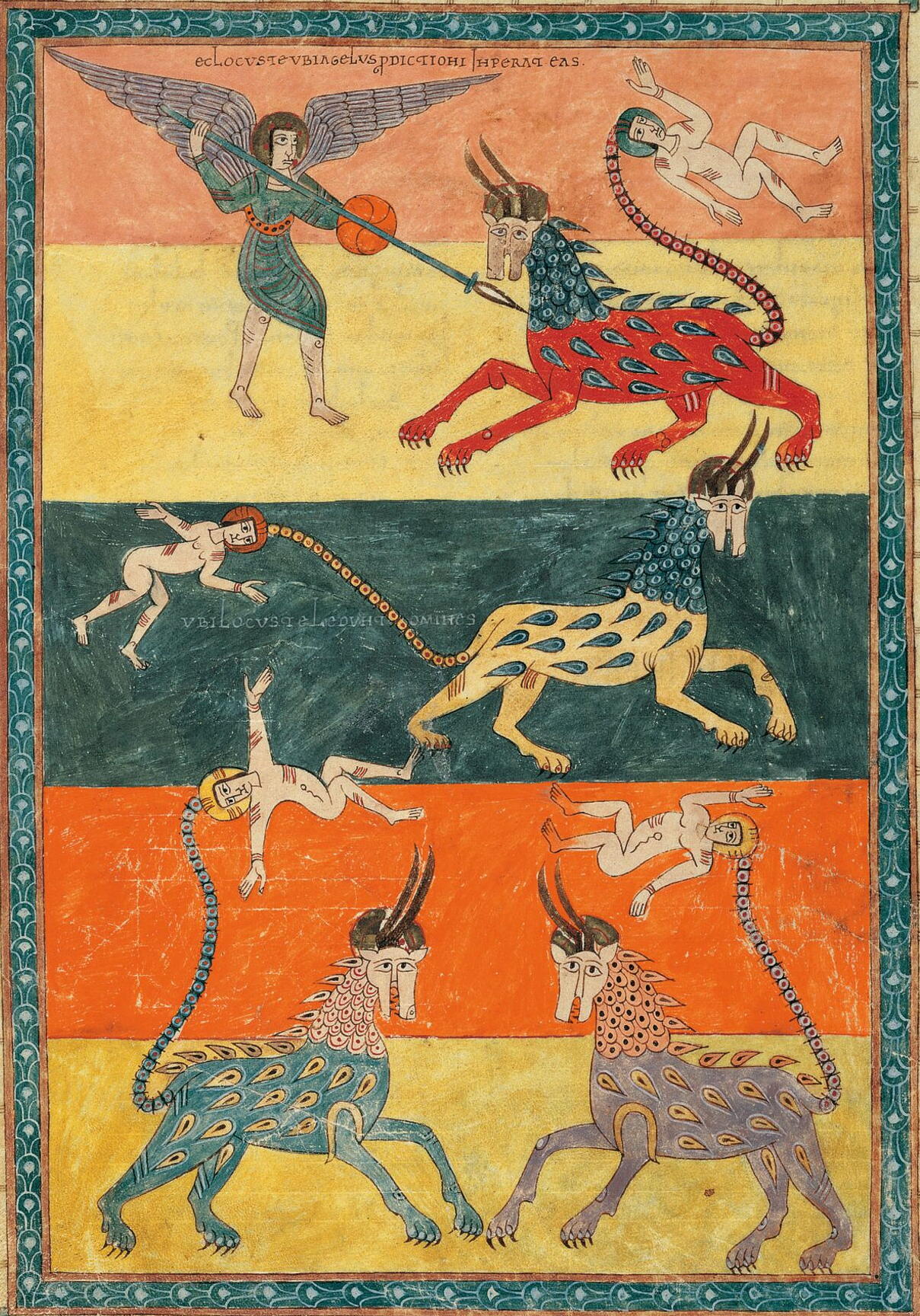 This full-folio image shows, at the top, the angel of the abyss –beneath the legend “EC LOCVSTE VBI ANGELVS P[ER]DICTIONI INPERAT EAS”– Abbadon or Appolion, meaning destroyer but with no negative connotation, with a nimbus and his wings outstretched, clutching a small shield and brandishing a spear at one of the infernal locusts