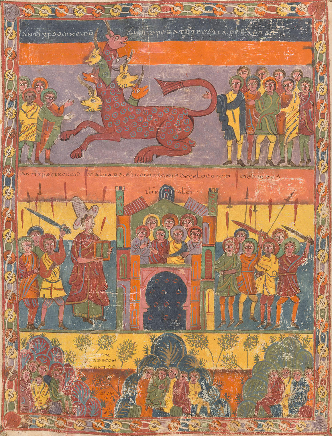 215v Satan freed. Above - the seven-headed beast flanked by two groups of men representing nations.