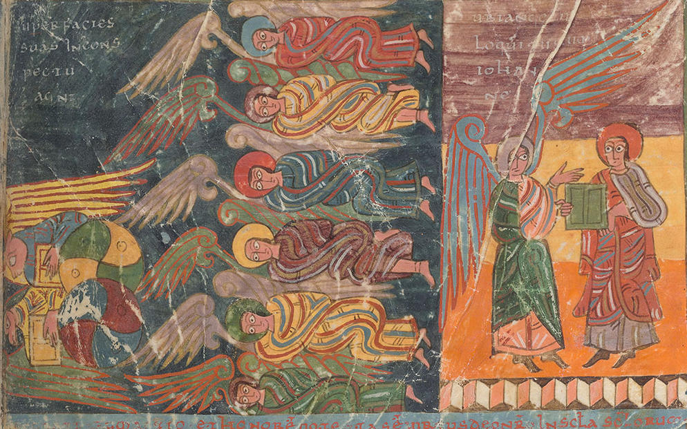 These are flanked by two groups of angels. In rectangle at right, an angle addresses John, holding an open book.
