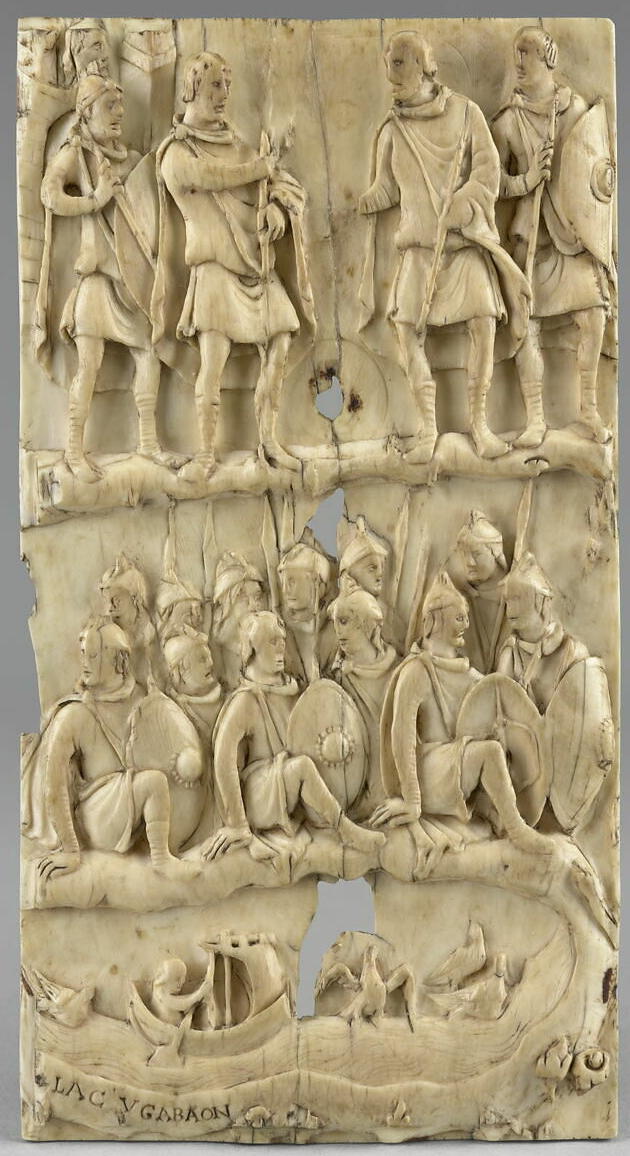 A larger print by Goldschmidt of 'Abner and Joab at the Pool of Gibeon'. Carolingian Ivory Panel, 9th century. Louvre, MR 374.