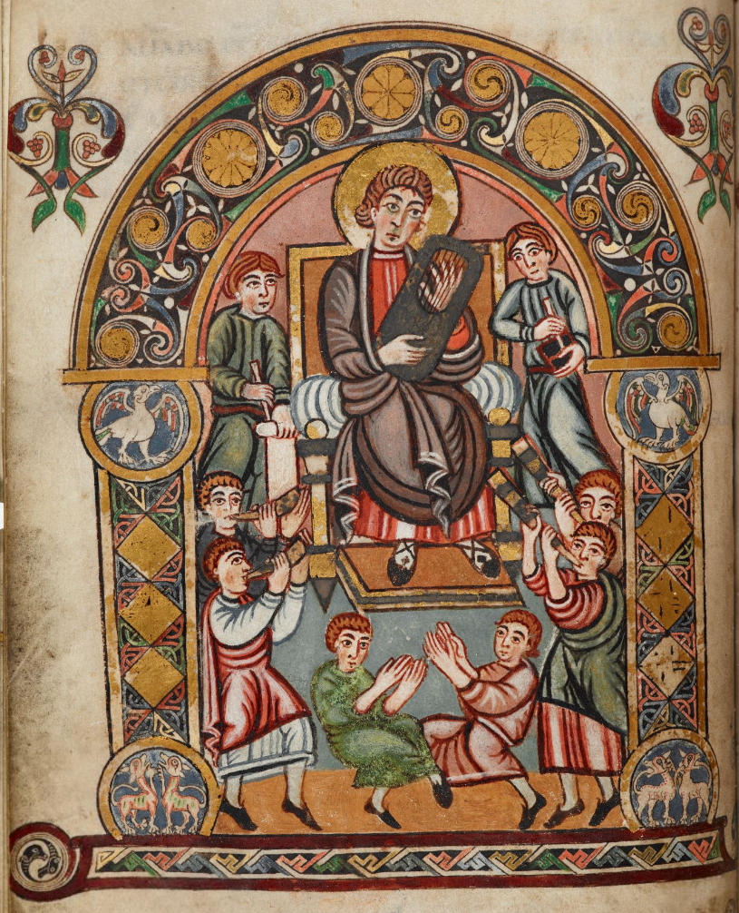 See also the David playing a harp with musicians Ethan, Iduthin, Asaph & Eman and soldiers Cerethi et Phelethi, Vivian Bible, Carolingian France, 845-851AD. BnF MS Latin 1.