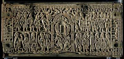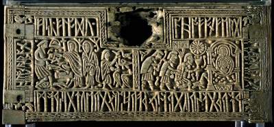 Franks Casket - front, Weland the Smith / Adoration of the Magi