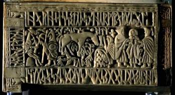 Lidded rectangular box made of whale-bone, carved on the sides and top in relief with scenes from Roman, Jewish, Christian and Germanic tradition. The base is constructed from four sides slotted and pegged into corner uprights, the bottom plates fitted into grooves at the base of the sides. It possibly stood on four low feet. Only one decorative panel now survives in the lid, the remaining elements being almost certainly replacements.