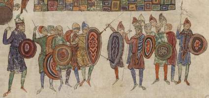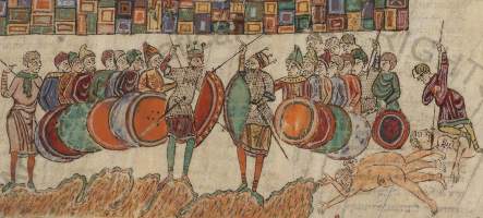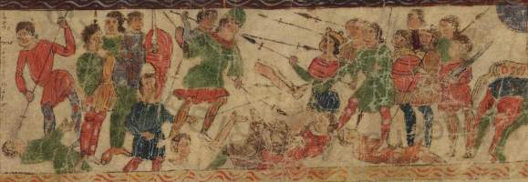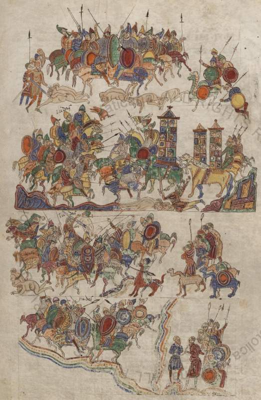 A - Pharaoh's Guard, f.6v; B - Defeat of the Amalekites, f.94v; C-D - Pharaoh's army, f.82; E - Army of Nebuchadnezzar, f.227; F - Holofernes, f.327; G-K[L] - Battle of Bethhoron, f.342;L-M -Battle against Nicanor[Guard of King Antiochus], f.235[352]. The Farfa Bible, though in much the same style as the Roda Bible, is stylistically freer and includes more obvious references to Muslim or specifically North African costume. It may, in fact, be a slightly later manuscript, the clearer Islamic elements resulting from the Murābiṭ invasion of al-Andalus in the late 11th century. It is worth noting that all 'wicked' figures are dressed to some degree in the more obviously Islamic costume. Pharaoh's guard (A) has his sword slung in a manner not unlike that of southern France, while the defeated Amalekites (B) and Holofernes, captain of the army of Assur, are European in their equipment to the extent of even having unlaced mail ventails. Only Holofernes' mace-like weapon sets him apart. His slightly forward-angled conical helmet is a bit of an enigma, further suggesting a late 11th or even early 12th century date for the manuscript. On the other hand the Roda Bible could indicate that this form originated in the Mediterranean area, in Spain, Provence, Italy or even al-Andalus. Elsewhere in the Farfa Bible turbaned figures are associated with men wearing very tall hats, helmets or headcloths (E and H). These may be garbled versions of the face-covering fashions of the original Saharan Murābiṭîn.