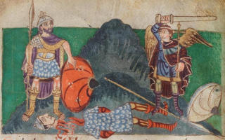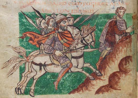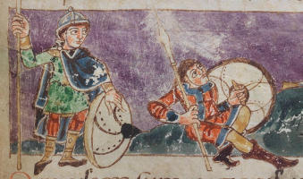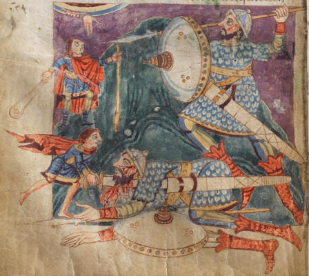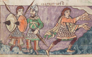 The Stuttgart Psalter portrays what appears to be a helmet with a mail curtain, this seems the most likely interpretation of the “helmum cum hasbergha.” "Carolingian Arms and Armor in the Ninth Century" by Simon Coupland, in Viator: Medieval and Renaissance Studies v.21 (1990)