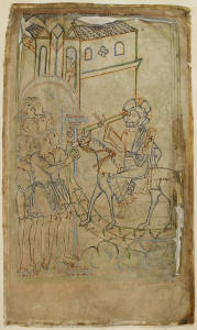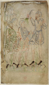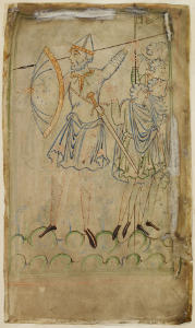 f. 9r: Goliath, with a helm, shield, and sword; a group of people (Philistines) behind him, fleeing;