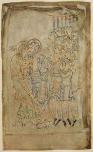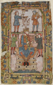 f. 126v: The Holy Trinity, in a quatrefoil within a circle, with God the Father in the middle, the Lamb on his right and the Dove on his left. Includes Wormald's 'Type II' initials (Francis Wormald, 'Decorated initials' (1945), p. 126). This is the only Anglo-Saxon Psalter with a prefixed cycle of pictures, according to Kauffmann, Romanesque Manuscripts (1975) p. 17, and the earliest surviving example of a Psalter with prefatory illustrations, according to Zeitler, Queen Melisende Psalter (2000) p. 72.