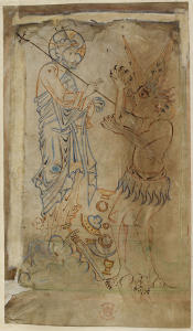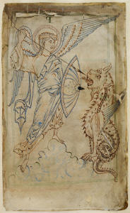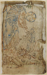 f. 114v: Christ with a cross and staff, trampling on a dragon;