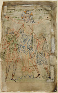 f. 13r: The Crucifixion, with one Roman soldier piercing Christ's side with a spear, the other holding a sponge;