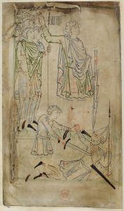 f. 8v: David with his sling and a group of Israelites behind, and, below, David thrusting Goliath's sword into his chest;