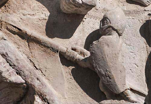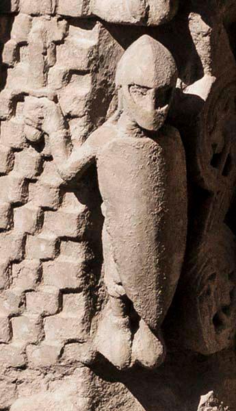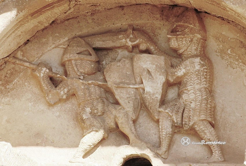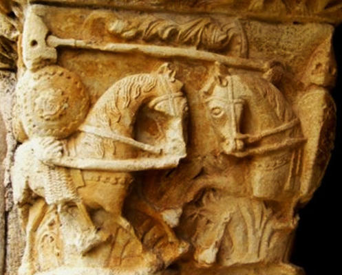 Soldiers in facemask helmets on the portal of Santa María la Real de Sangüesa, Navarre, c.1200.