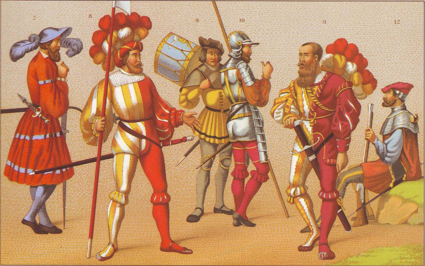 3 A group of soldiers from the army of Francois I, thus part of the legionary structure that was abandoned later. 3.9 is a drummer; 3.10 a halberdier; and 3.12 is an arquebusier, wearing a iron skullcap, called a secrette, beneath his cap.