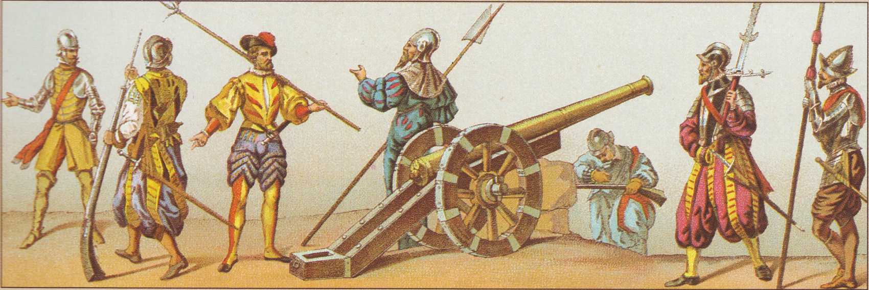 THE HISTORICAL ENCYCLOPEDIA OF COSTUMEALBERT RACINETTHE CLASSIC WORK OF THE 19TH CENTURYp177-178 EUROPE FROM BYZANTIUM TO THE 19TH CENTURYFRANCE16TH-CENTURY MILITARY COSTUMEMiddle Register 2.1, 2 & 5 An officer, an arquebusier and a halberdier from one of the many mercenary bands employed by France. ![]() Back to France: 16th-Century Military Costume by Racinet |