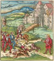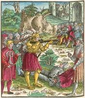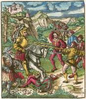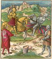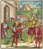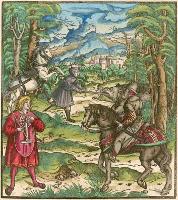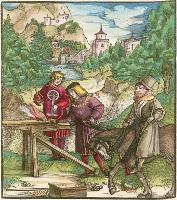 Die geuerlicheiten un einsteils der geschichten des loblichen streytparen und hochberümbten helds und Ritters heer Tewrdannckhs (literally translated as The Adventures of the honourable, valorous and far-famed knight, Sir Theuerdank) - was commissioned by Emperor Maximilian I intended to chronicle his life. It was printed and coloured in 1517. The 118 large illustrations to Theuerdank were a collaboration between a variety of artists, including Hans Burgkmair (13), Leonard Beck (77), Hans Schäuffelein (20), Erhard Schön (3), Wolfgang Traut (2), the Master NH (1), Hans Weiditz (1 possibly) and Jörg Breu I (1). Tradition suggests that the text to Theuerdank was written by one of the Emperor's close friends - Melchior Pfintzing. However, it is likely that much, if not all, the text was supplied by the Emperor himself. The tale tells a fictional version of the journey taken by the Emperor to meet his betrothed, Maria of Burgundy (the daughter of Charles the Bold of Burgundy). Source