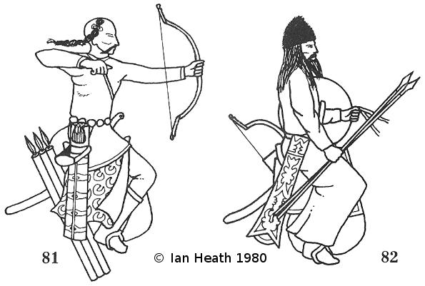 81 and 82 are each armed with sabre (a curved, one-edged cutting sword which generally replaced the straight sword c. 700) and a composite bow of which 2 or sometimes 3 were often carried. Quivers apparently contained up to 60 arrows but more commonly held 24-30, usually carried point uppermost. These arrows were light, which somewhat limited their penetration. Both carry in addition light, hollow javelins, 81 having them in a case suspended from the saddle. Lassoes were also carried to entangle enemy riders and horses in close combat. Magyars and Pechenegs at least are recorded to have sometimes carried axes, and most Asiatics probably also carried small circular shields of leather or interwoven osiers.