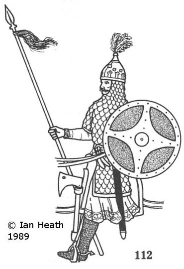 Arms consisted of a sword in a red, green or yellow sheath, a lance of about 8 feet and usually an axe.