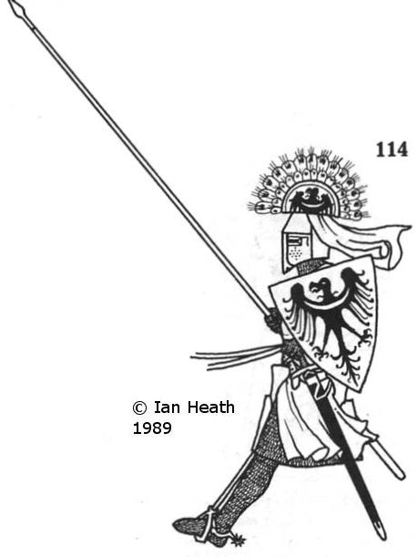 but interestingly though the early-14th century tomb effigy of Duke Henry IV also depicts such a crested helmet a panel on the side of the tomb portraying a battle-scene shows him in an ordinary, uncrested heaume.