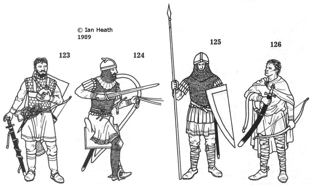 Bearing in mind that Serbia was part of the Byzantine Empire until the last quarter of the 12th century, and even thereafter remained culturally within the Byzantine sphere of influence, it is hardly surprising to find that Serbian soldiers as depicted in 12th-14th century frescoes and mss. are virtually indistinguishable from those of Byzantium, a state of affairs which only began to change as Western European influence exerted itself (via Hungary) in the course of the 13th-14th centuries. Even then, Byzantine-style equipment remained in use alongside the more characteristic Western panoply that was introduced, being especially evident in the retention of the recurved bow and traditional types of shield, sword (specifically the korda, a single-edged weapon with a slightly curved blade and a hilt shaped in the form of a bird's head), knife and other weapons (eg, the kijacek, a wooden maul similar to those later used by English archers). In fact the 4 figures depicted here — 2 foot-soldiers and 2 oklopniki (heavy cavalrymen) — show little evidence of Western influence, with the single exception of 124’s poleyns fitted to his mail chausses. Their pteruge-edged, hip-length corselets are characteristically Byzantine, right down to the reinforcing leather breast- and shoulder-bands of 123 and 124. Some idea of the defensive capabilities of such armour can be assessed from an episode recorded by Cinnamus, where during a battle in 1150 a Byzantine cataphract was unable to drive his lance through a Serbian zupan's back because of the strength of the latter’s corselet.